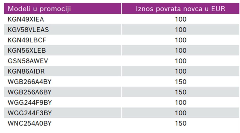 Kupnjom jednog od uključenih modela, krajnji kupci mogu ostvariti povrat novca prema sljedećim modelima: